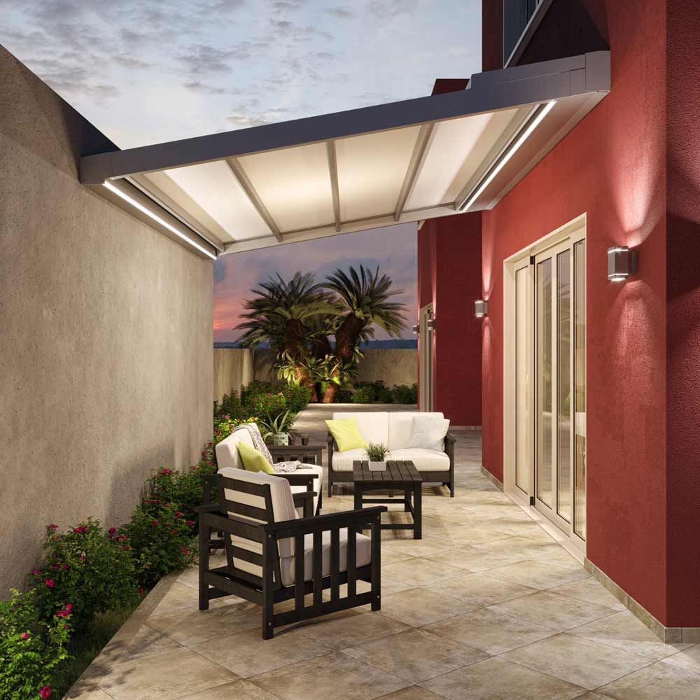 Le nostre pergole telo retrattile sono disponibili in diverse finiture e possono essere personalizzate per integrarsi perfettamente con l’architettura della tua casa, creando un ambiente esterno accogliente e protetto.
